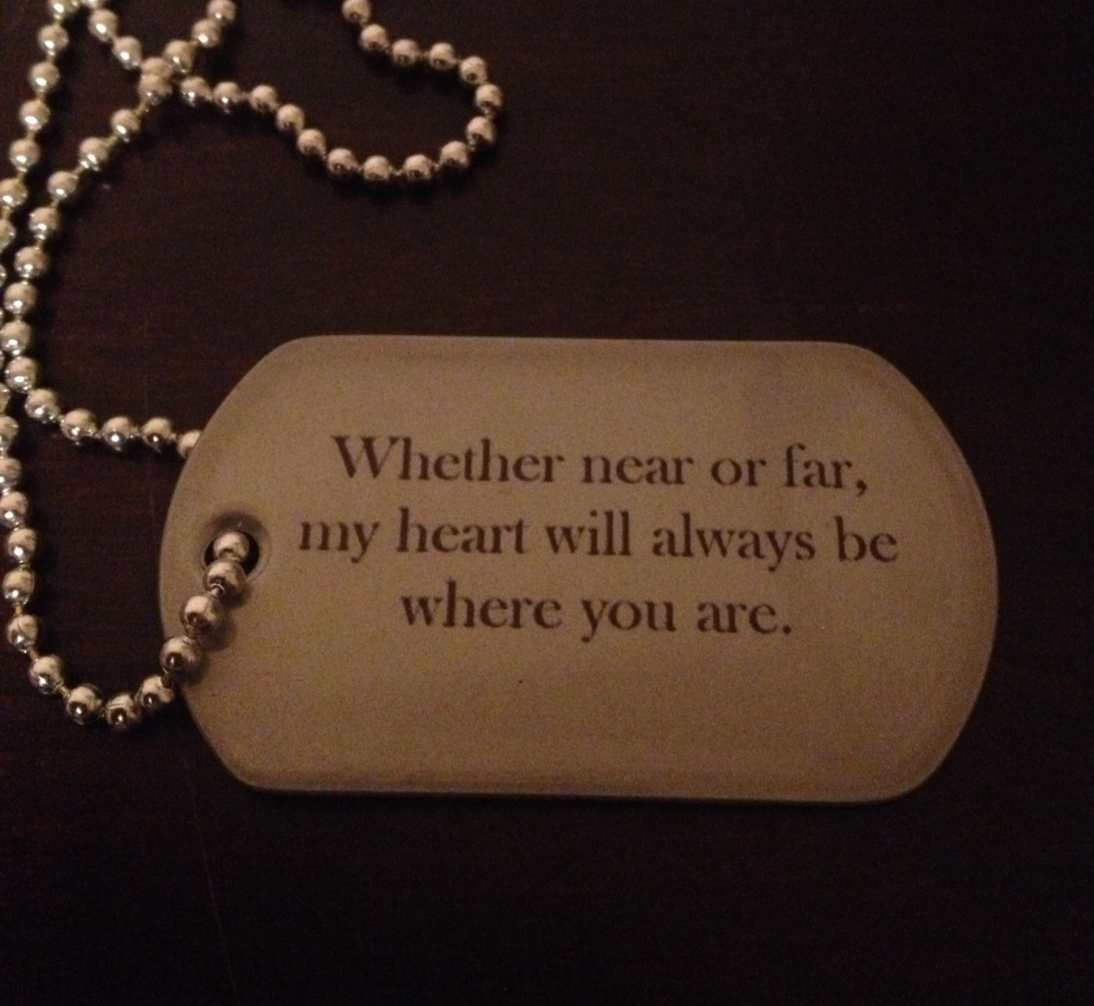 These printed dog tags are a great way to think of someone while they are away. They make a great gift to send home to loved ones during deployments or time away just to let them know you are thinking of them. Come with choice of silencer - red, pink, purple, green, blue, black, camo, pink camo or sky blue camo. Dog tags come on a 24" ball chain.